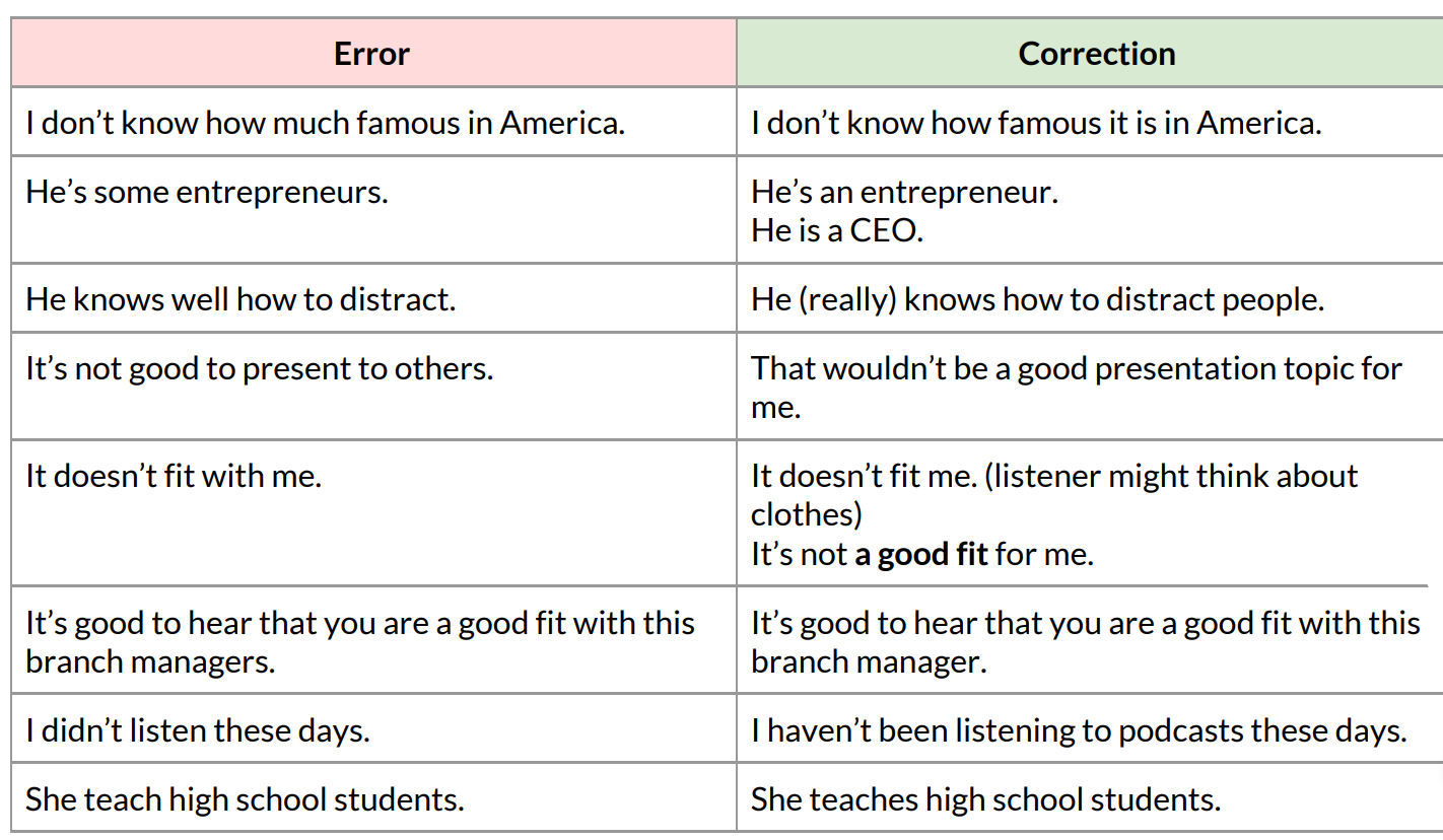 티처들과 수업할 때보면 간혹 즐겨찾기나 바탕화면에 모아둔 자료들을 학생들이 실수할 때마다 꺼내서 알려주곤 하던데, 그런 방법도 좋지만 기본적으로 다양한 표현과 문법에 적응할 수 있게 커리큘럼에 아예 하나씩 포함해서 알려줘도 좋지 않을까 하는 생각이 들었다.