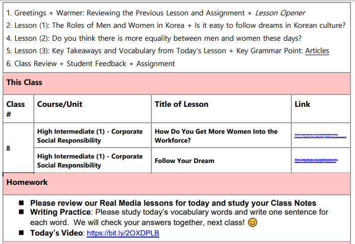 원어민 티처가 수업 후 적어주는 레슨 노트가 짧으면 3~4페이지 보통 5페이지 정도인데 이번에 10페이지다. 오늘 티처는 친절하시기도 하고 우연히 내가 읽은 책이 티처 전공 관련 책이라 다양한 주제로 이야길 했다.