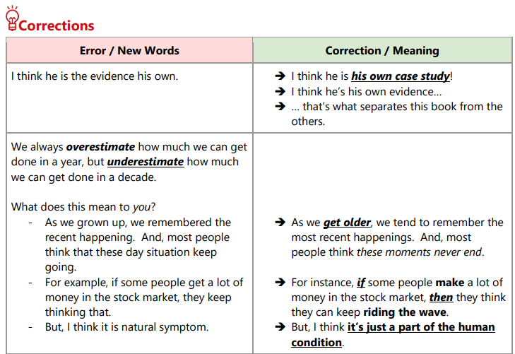 바로바로 교정해주는 것이 좋은것이라 생각했는데 이번 티처는 일단 다 듣고 나중에 수업 이후 수정해서 레슨노트에 올려 준다. 그만큼 학생이 말하는 시간을 늘려주는 것이라 좋은 것 같다. 수정된 것으로 자연스레 말할 수 있게 연습해야겠다.